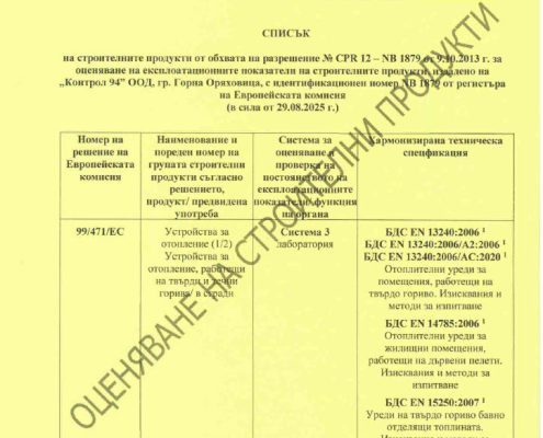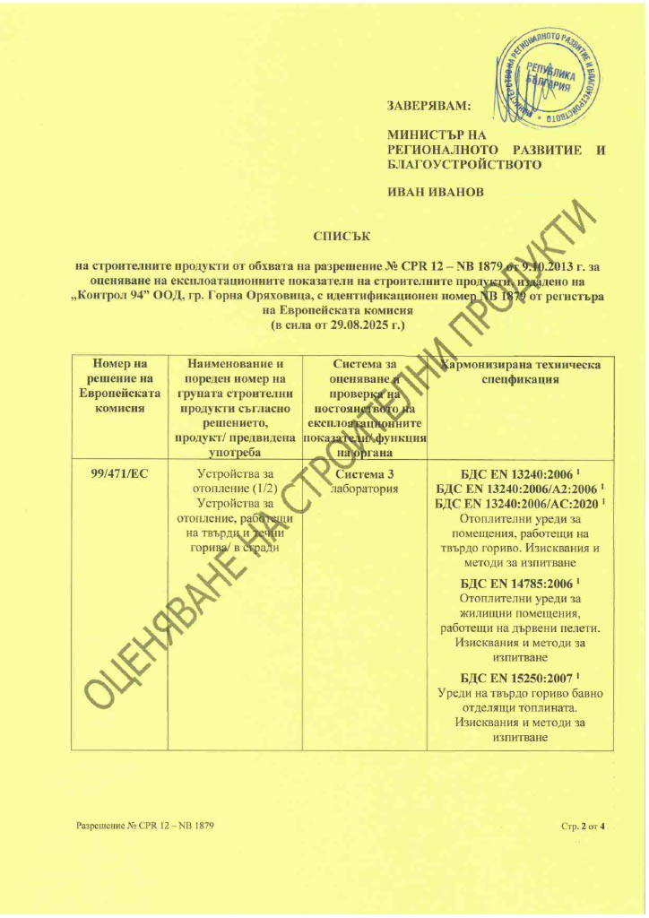 I. Kontrol 94 Ltd. is attested and holds Permit No CPR 12- NB1879/09.10.2013 of the Ministry of Regional Development and Public Works for evaluation of the conformity of construction products according to Regulation (EU) 305/2011.
