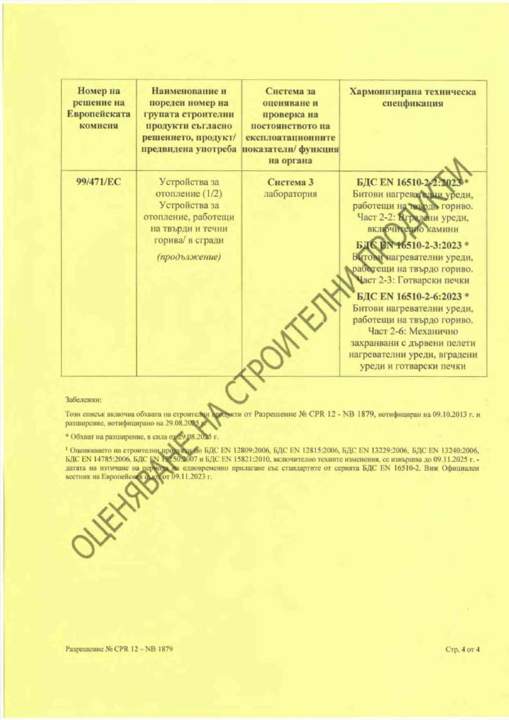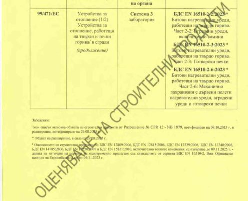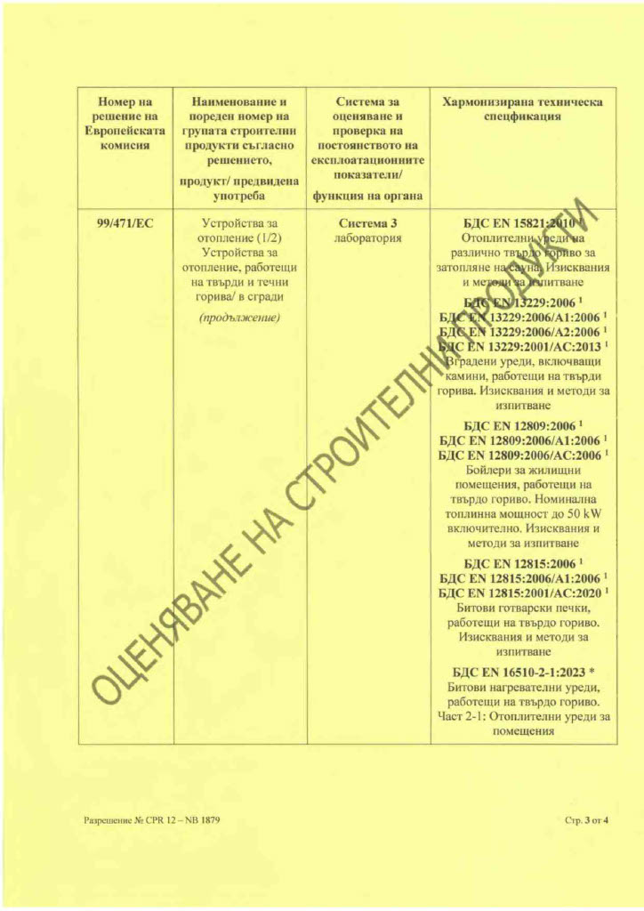 The laboratory for testing of solid fuel appliances is approved DIN CERTCO test center with registration number № PL 211 according to the following standard specifications: